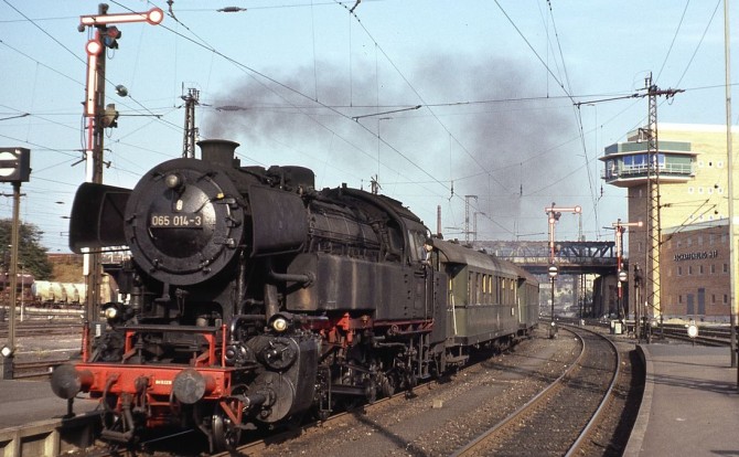 Bild unten: Die jetzt mit EDV-Nummer 065 014-3 beschriftete 65 014 verlässt des Aschaffenburger Bahnhof. © Peter Schiffer / Slg. Eisenbahnstiftung